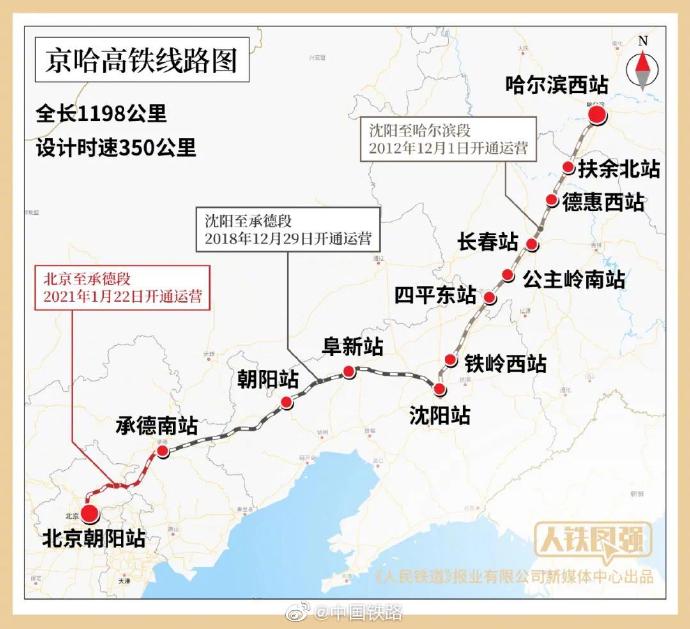 北京至哈尔滨高铁北京至承德段将于2021年1月22日开通运营,京承段的建成通车,标志着京哈高铁全线贯通。