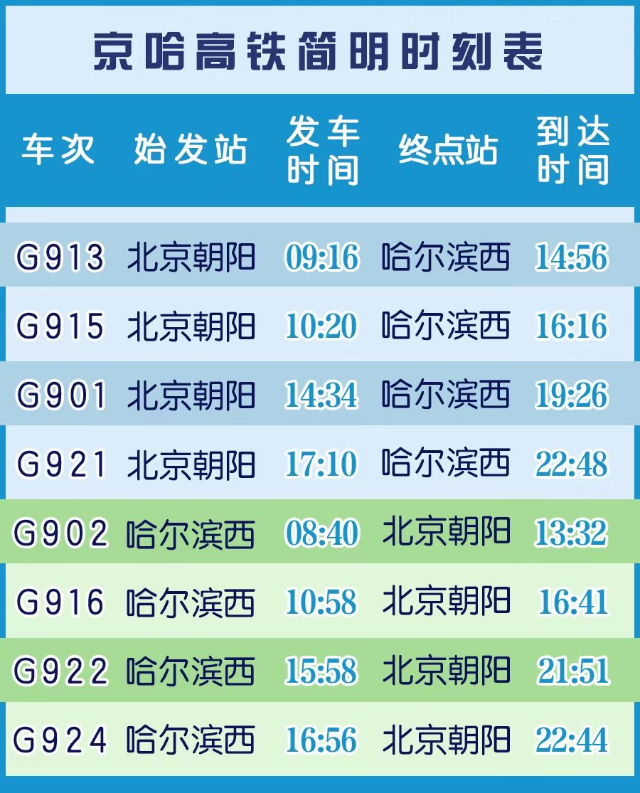 京哈高铁南起北京市朝阳区,北至黑龙江省哈尔滨市,全长1198公里,设计时速350公里。开通的第一天,京哈两站之间安排开行了4对高速动车组列车。