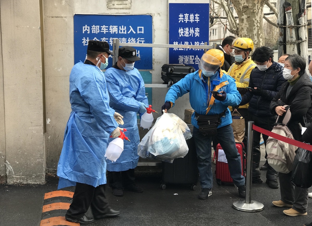 △2021年1月21日,上海复旦大学附属肿瘤医院徐汇院区(东安路270号)门诊停诊。亲友、快递、外卖为肿瘤医院在院人员送食品和生活用品。