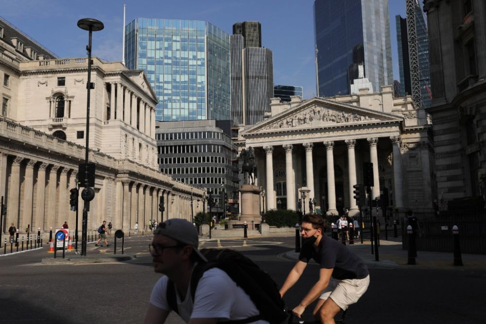 2020年9月16日,在英国伦敦,两名男子骑车从英格兰银行(左)旁经过。(新华社发,蒂姆·爱尔兰摄)