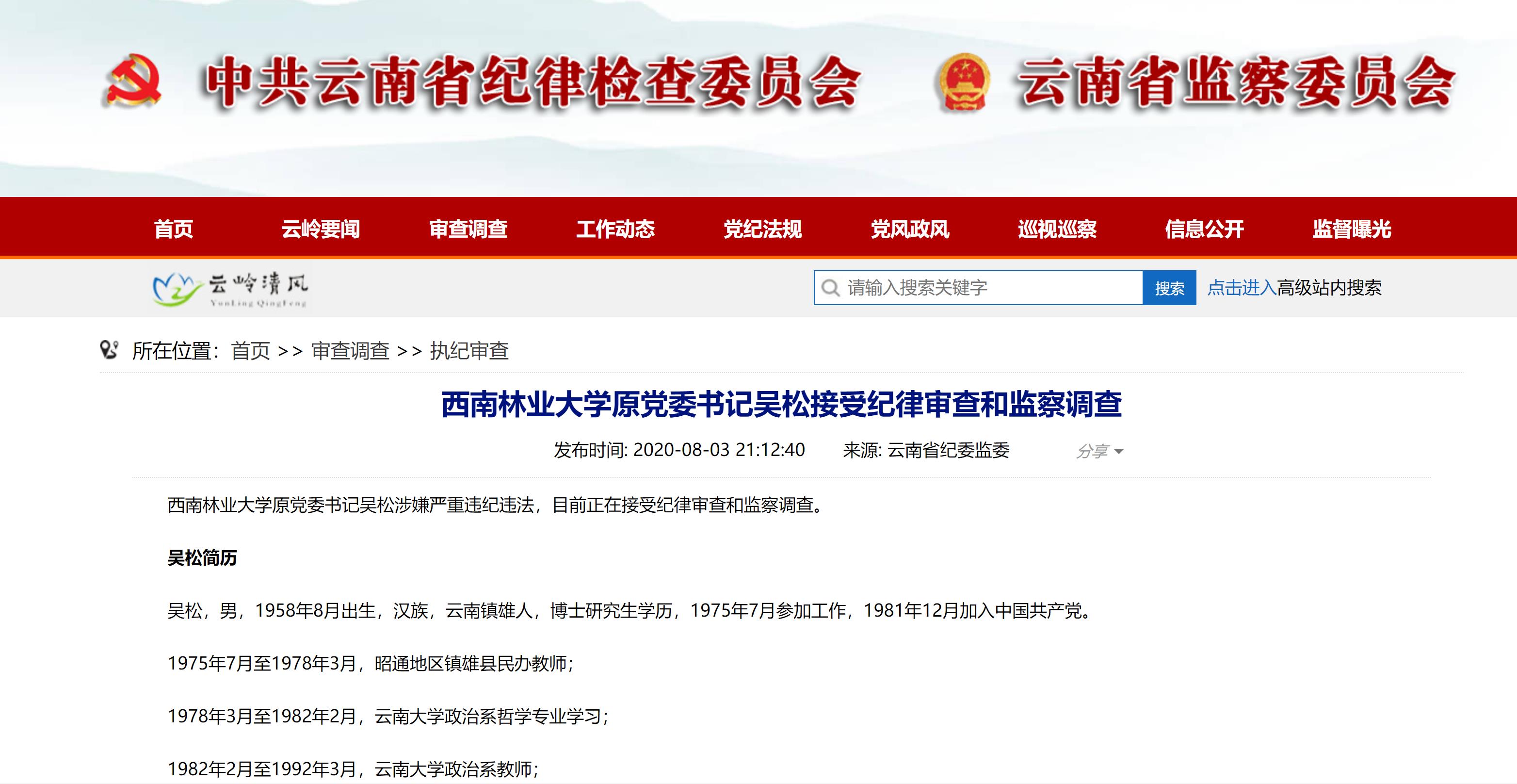 2020年8月3日,云南省纪委省监委发布消息,西南林业大学原党委书记吴松涉嫌严重违纪违法,接受纪律审查和监察调查。