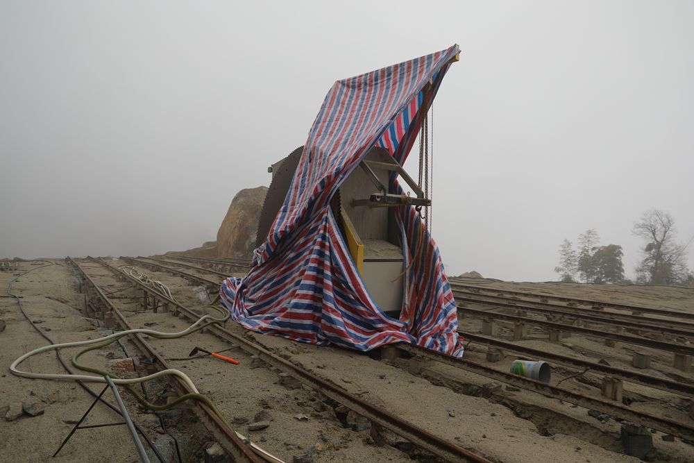 高城镇里山村坐落在一座小山脚下,山坡顶部是杨孔章采石场的作业平台。沿山路而上,记者注意到路边有新建的水渠和沉淀池,而在山顶的作业面,几台硕大的机器设备上都盖着防水彩条布,没有生产迹象。