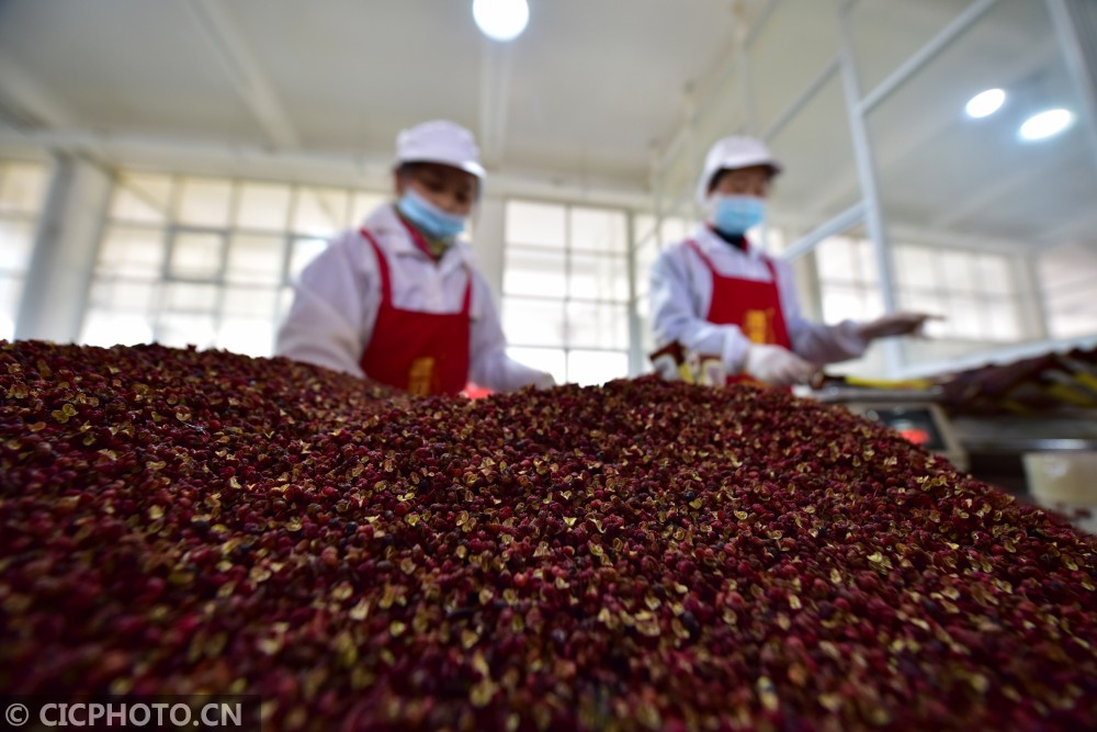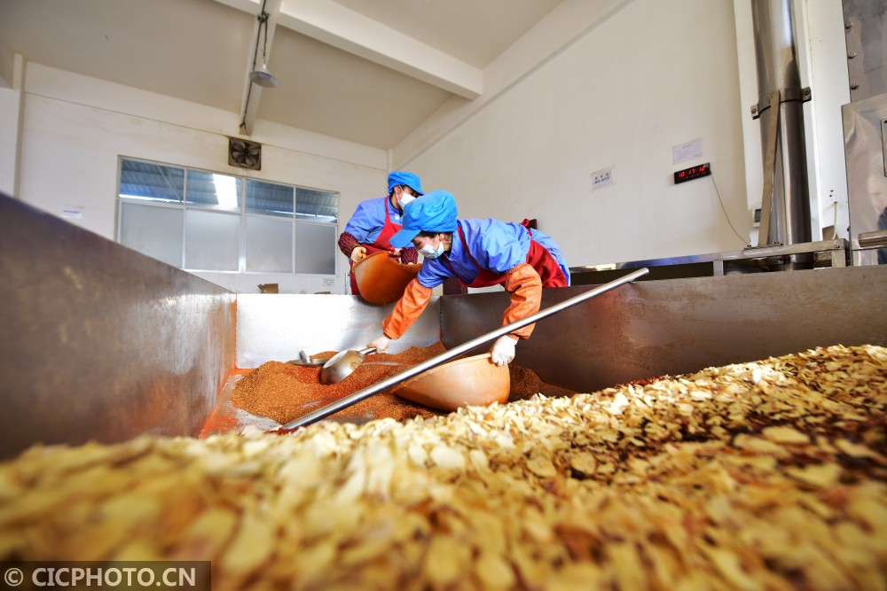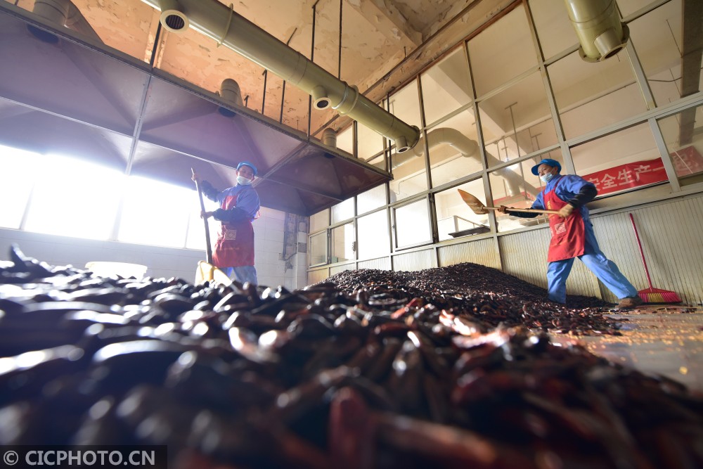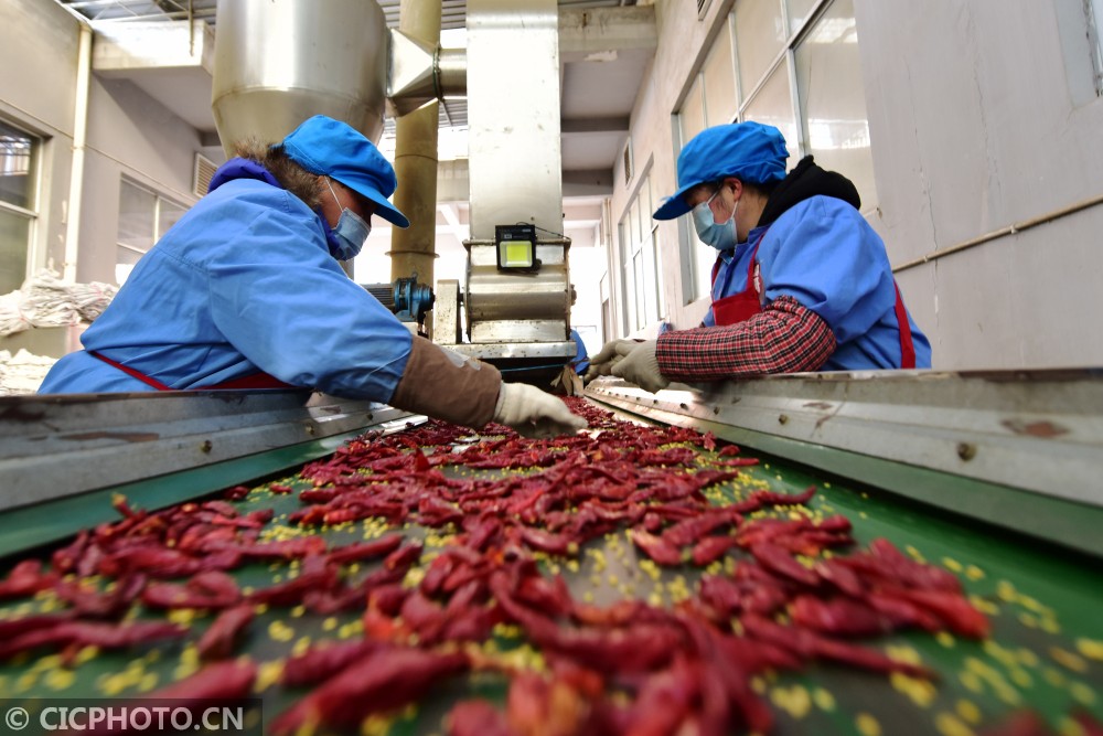 以上图片:2021年1月19日,贵州省龙里县一辣椒加工企业的工人在生产车间作业。CICPHOTO/龙毅 摄