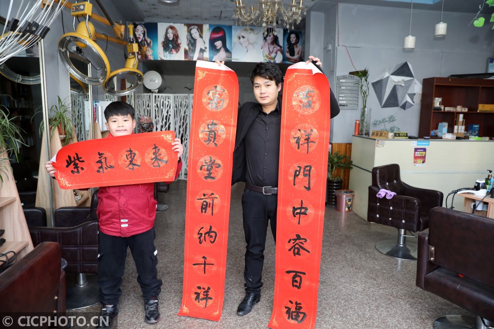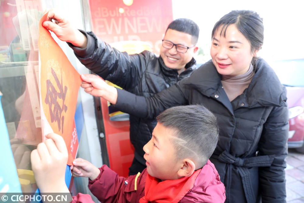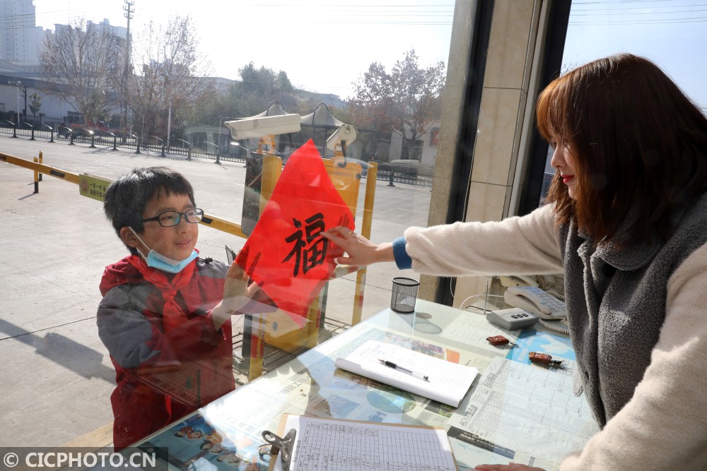 ↑浙江省东阳市江北小学教育集团的学生把写好的春联和福字送给留在东阳市过年的家人。CICPHOTO/包康轩 摄