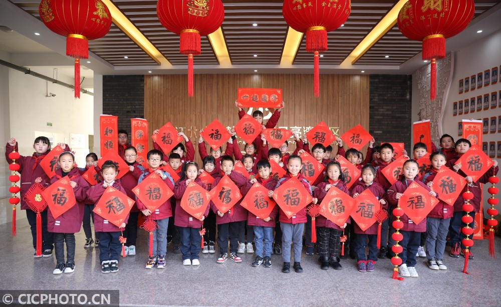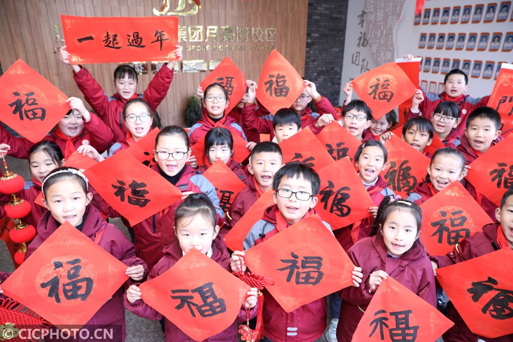 ↑浙江省东阳市江北小学教育集团的学生展示春联和福字。CICPHOTO/包康轩 摄