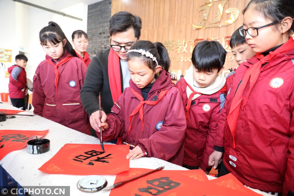 ↑浙江省东阳市江北小学教育集团的学生在老师指导下写福字。CICPHOTO/包康轩 摄