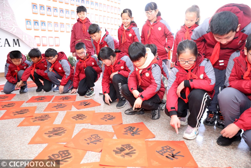 ↑浙江省东阳市江北小学教育集团的学生在观看书写好的春联和福字。CICPHOTO/包康轩 摄