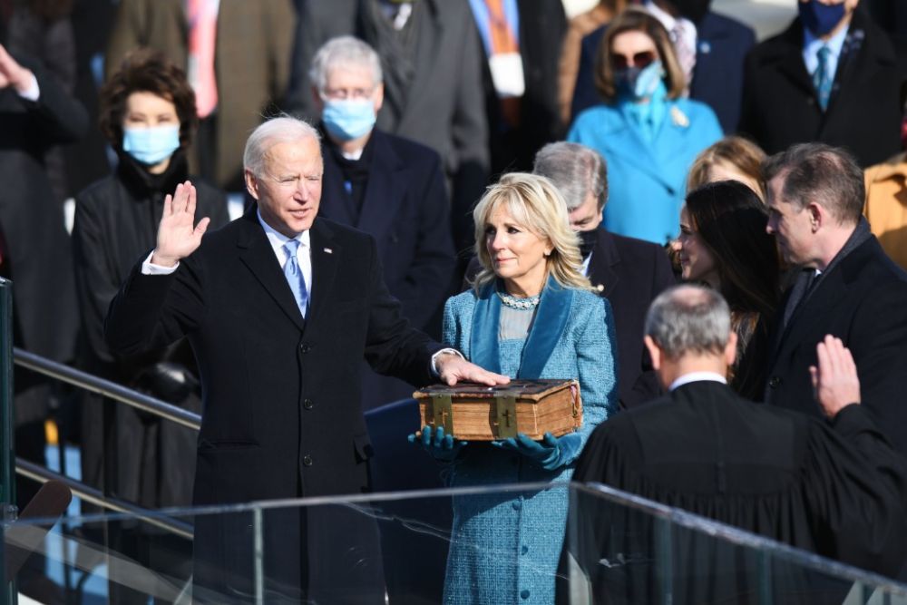 1月20日,在美国首都华盛顿国会山,拜登(前左)在美国第46任总统就职典礼上宣誓。(新华社记者刘杰摄)