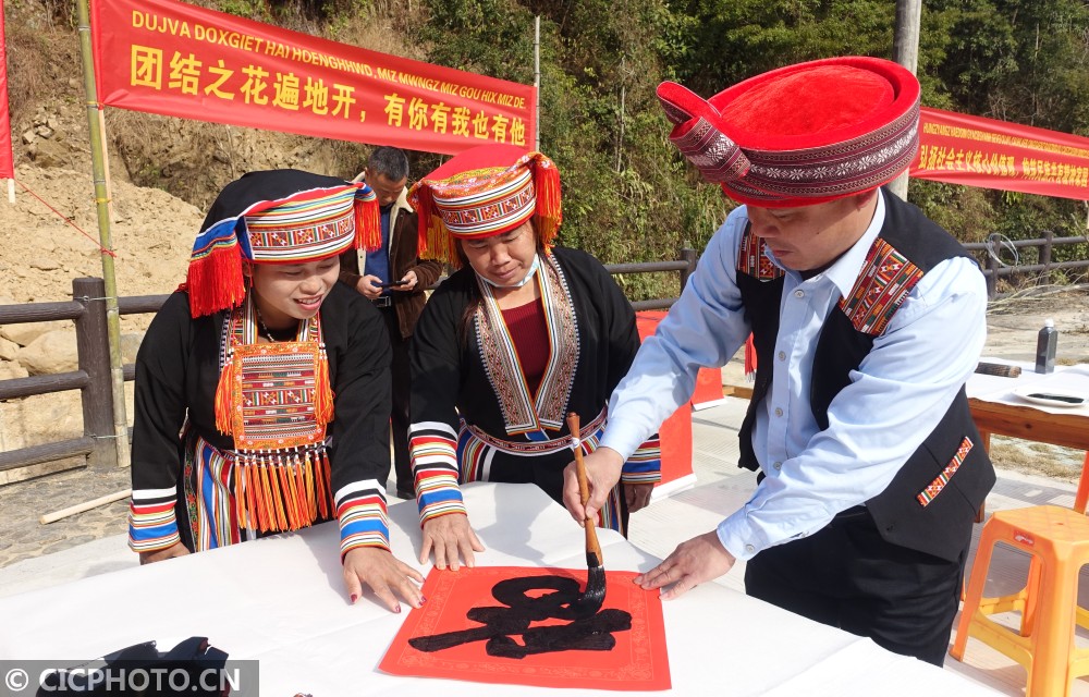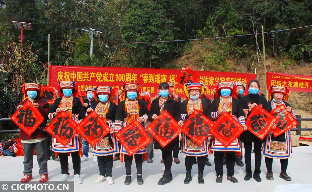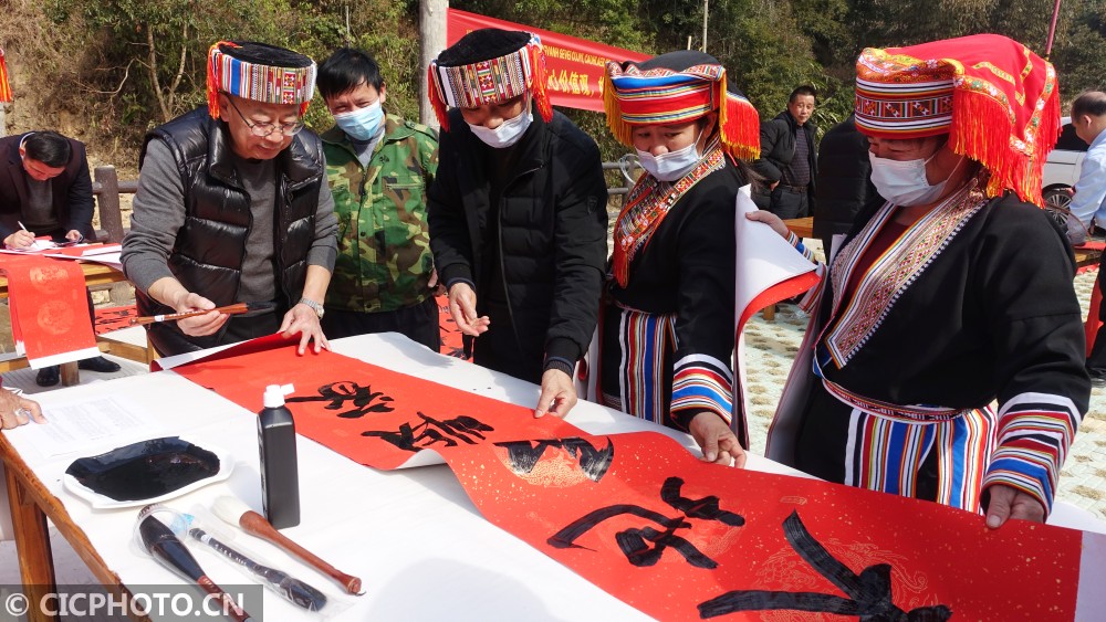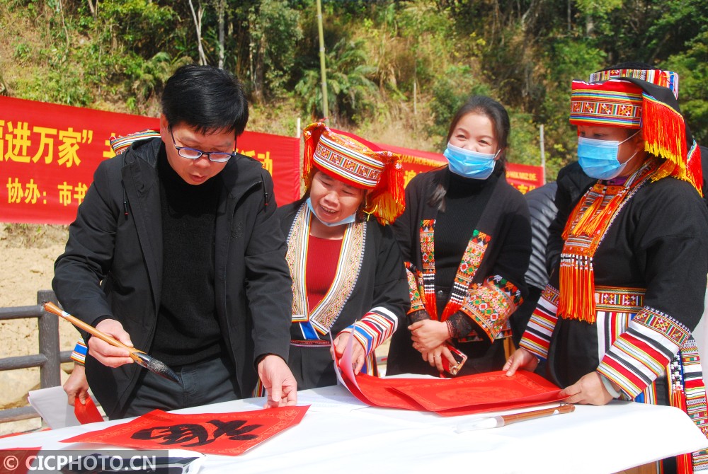 ↑2021年1月20日,在广西贺州市八步区步头镇瑶族山村黄石村,贺州市书法家会员在为瑶族群众书写福字。CICPHOTO/廖祖平 摄
