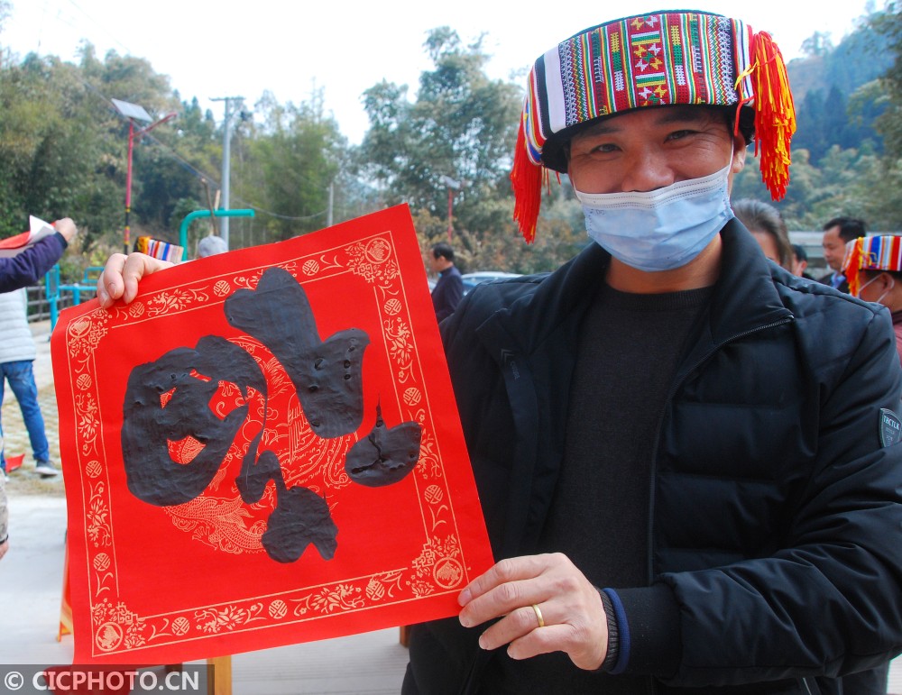 ↑2021年1月20日,在广西贺州市八步区步头镇瑶族山村黄石村,瑶族群众在展示书法家书写的大红福字。CICPHOTO/廖祖平 摄