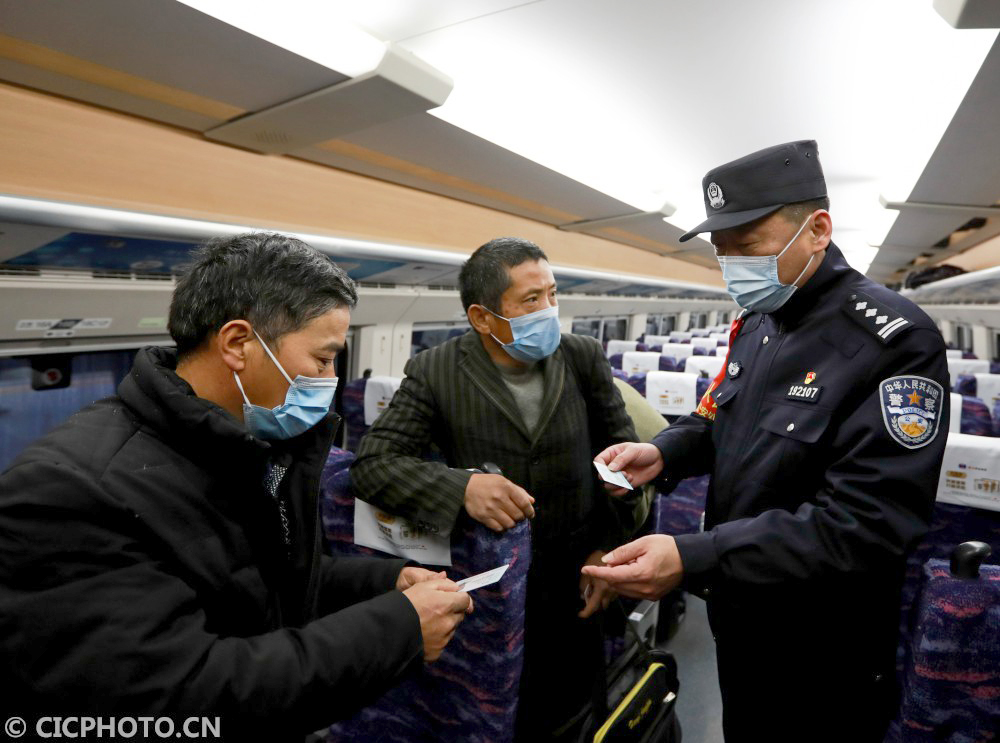 ↑2021年1月20日,湖北省武汉市,武汉铁路公安汉口乘警支队副支队长(右)在为乘坐D2882次动车组旅客解答疑惑。CICPHOTO/赵军 摄