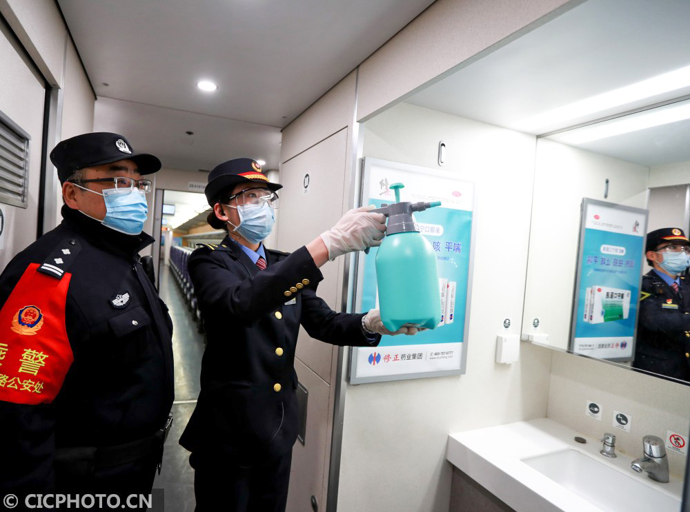 ↑2021年1月20日,湖北省武汉市,由汉口开往连云港的D2882次动车组列车长(右)与乘警对车厢洗漱台再次进行消毒。CICPHOTO/赵军 摄