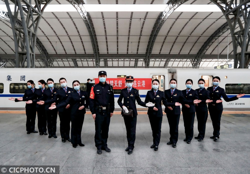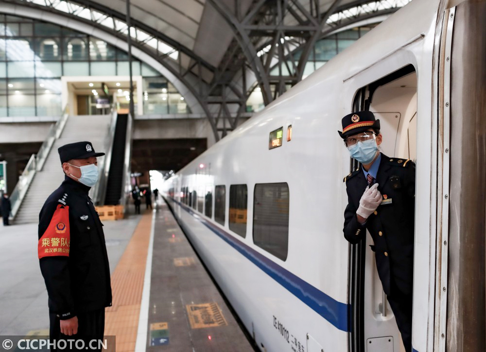 ↑2021年1月20日,湖北省武汉市,武汉客运段工作人员和铁路民警在汉口火车站站台迎接旅客乘坐D2882次动车组。CICPHOTO/赵军 摄