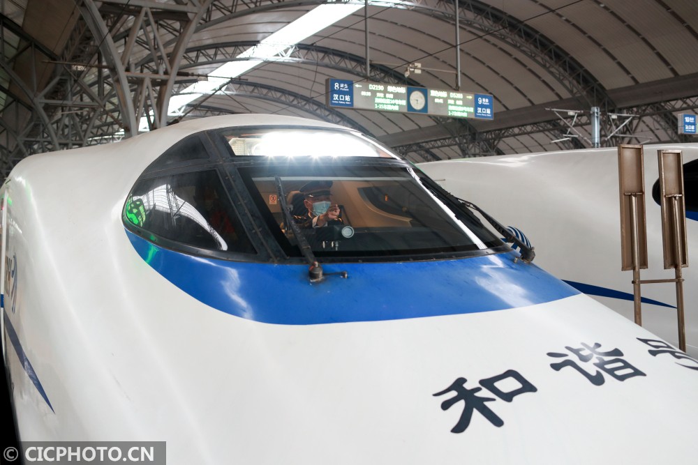 ↑2021年1月20日,湖北省武汉市汉口火车站,由汉口开往连云港的D2882次动车组准备开行。CICPHOTO/赵军 摄