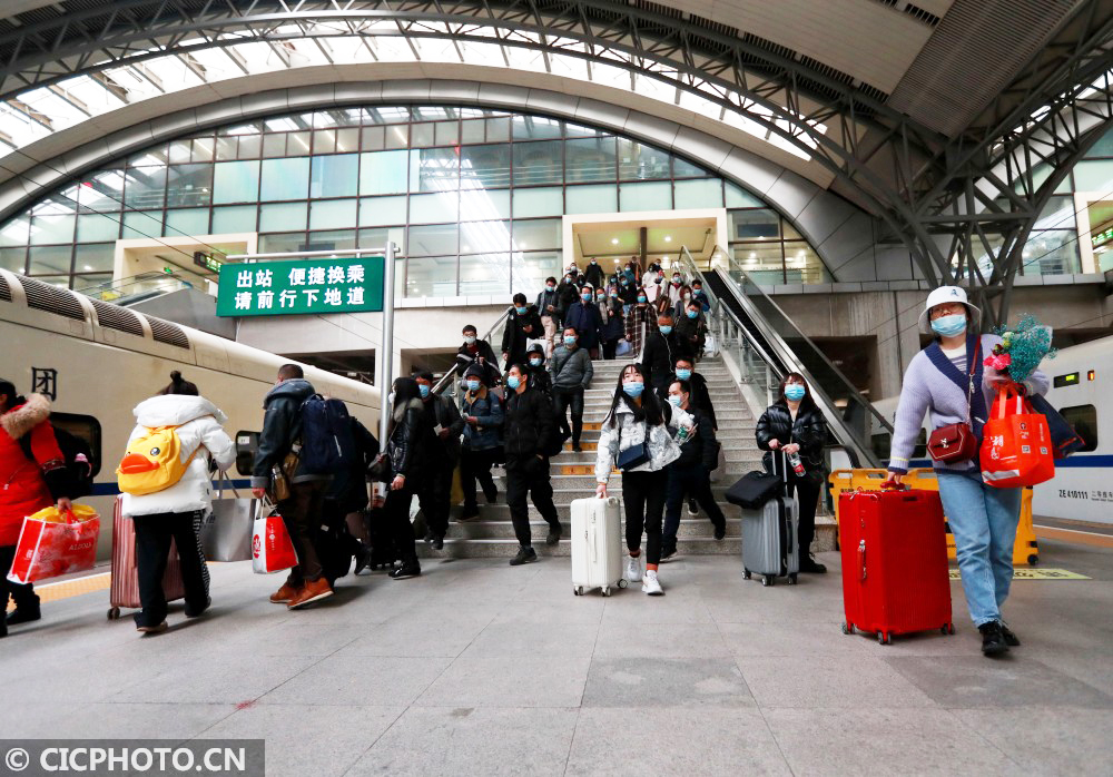 ↑2021年1月20日,旅客在湖北省武汉市汉口火车站乘坐D2882次动车组。CICPHOTO/赵军 摄