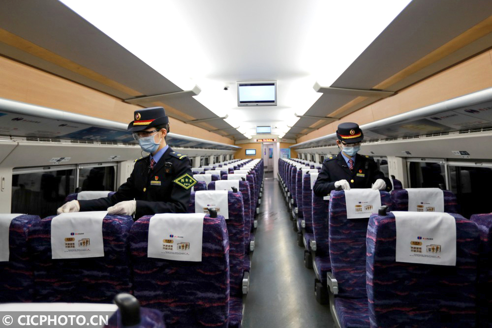 ↑2021年1月20日,湖北省武汉市,由汉口开往连云港的D2882次动车组列车长(左)和工作人员在整理车厢座椅。CICPHOTO/赵军 摄