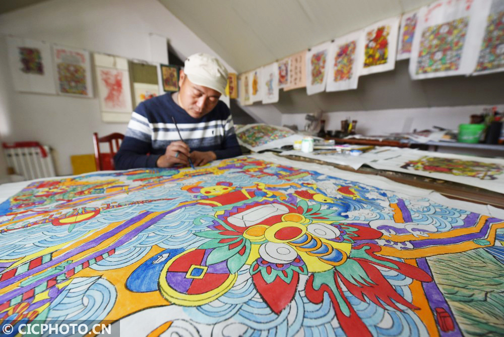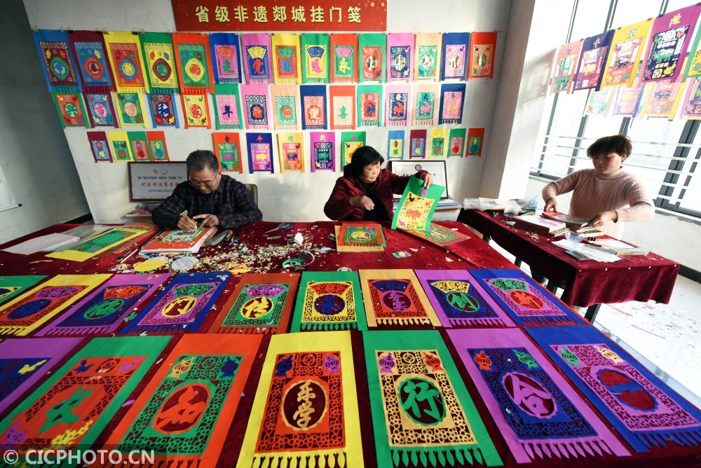 春节临近,山东省临沂市郯城县农民纷纷加工制作挂门笺、木版年画等年货供应节日市场。据了解,郯城挂门笺、木版年画都被列入省级非物质文化遗产,以其制作精良、色彩绚丽深受消费者喜爱。今年虽受疫情影响,村民通过网络推销,订单不断。山东部分农村至今还保留着迎新春贴年画、挂门笺的传统风俗。