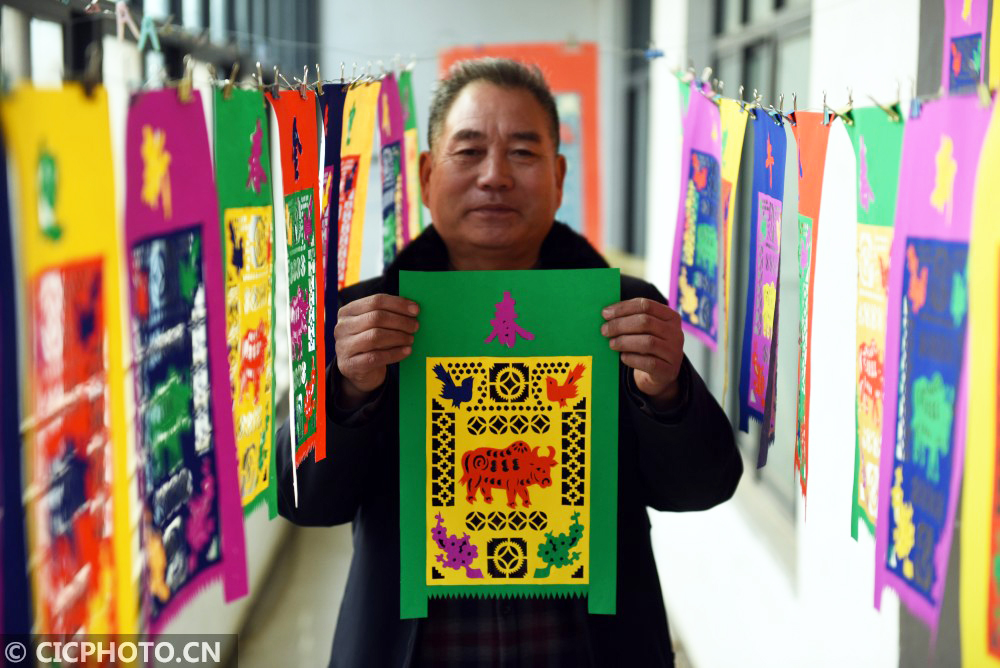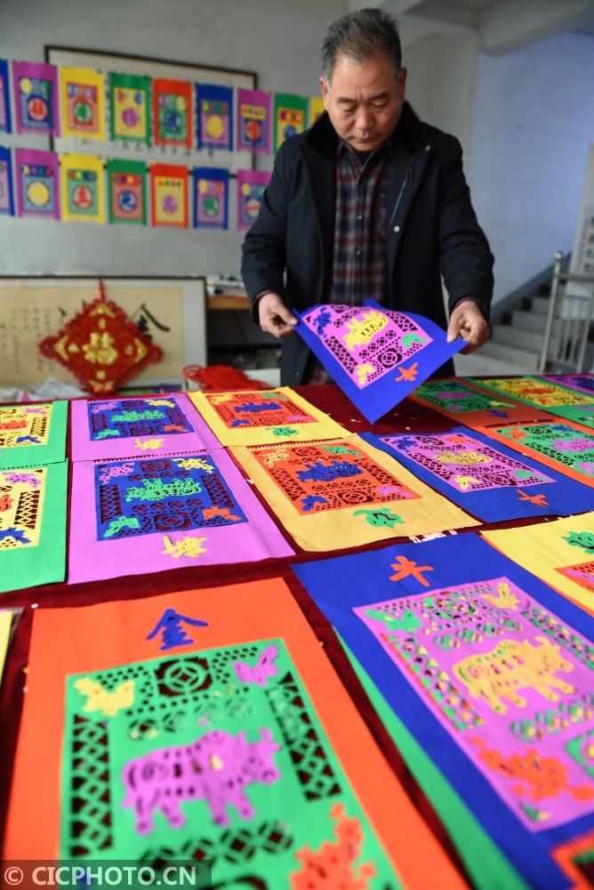 ↑2021年1月20日,山东省郯城县马头镇,民间艺人在展示制作的“牛年门笺”。CICPHOTO/房德华 摄