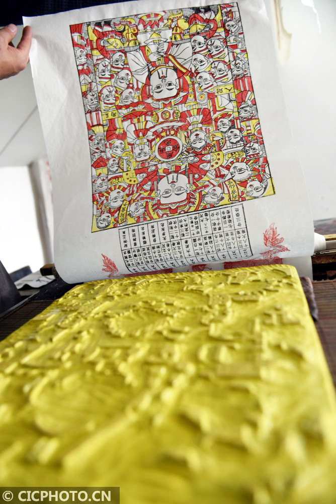 ↑2021年1月19日,山东省临沂市郯城县郯城街道办事处,民间艺人在展示加工的木版年画。CICPHOTO/房德华 摄