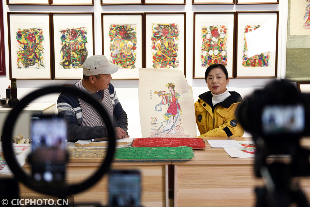 ↑2021年1月8日,山东省临沂市郯城县郯城街道办事处,民间艺人通过网络推销加工的木版年画。CICPHOTO/房德华 摄
