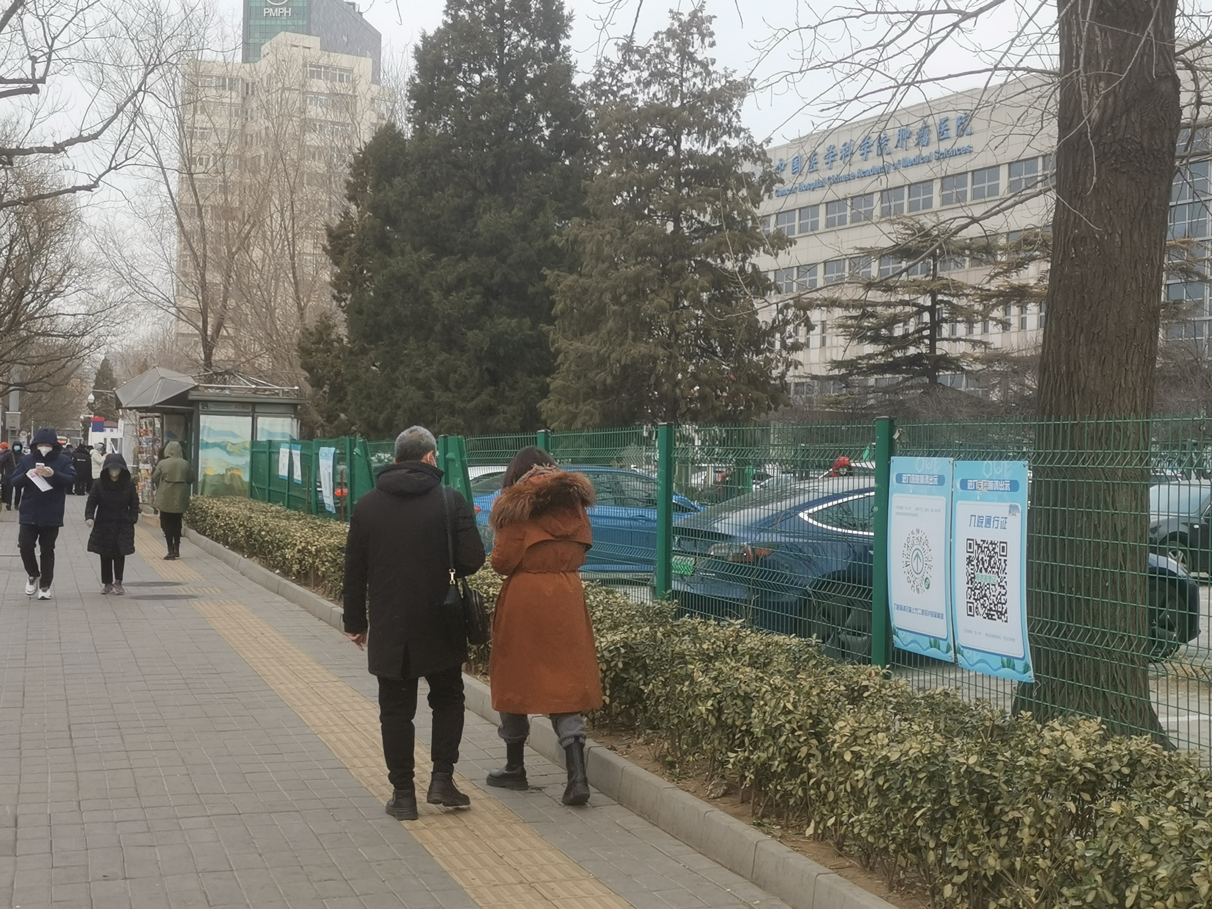 ↑1月19日,中国医学科学院肿瘤医院外,挂着就诊患者入院时必须要扫的二维码。照片均由新华每日电讯记者尹平平摄