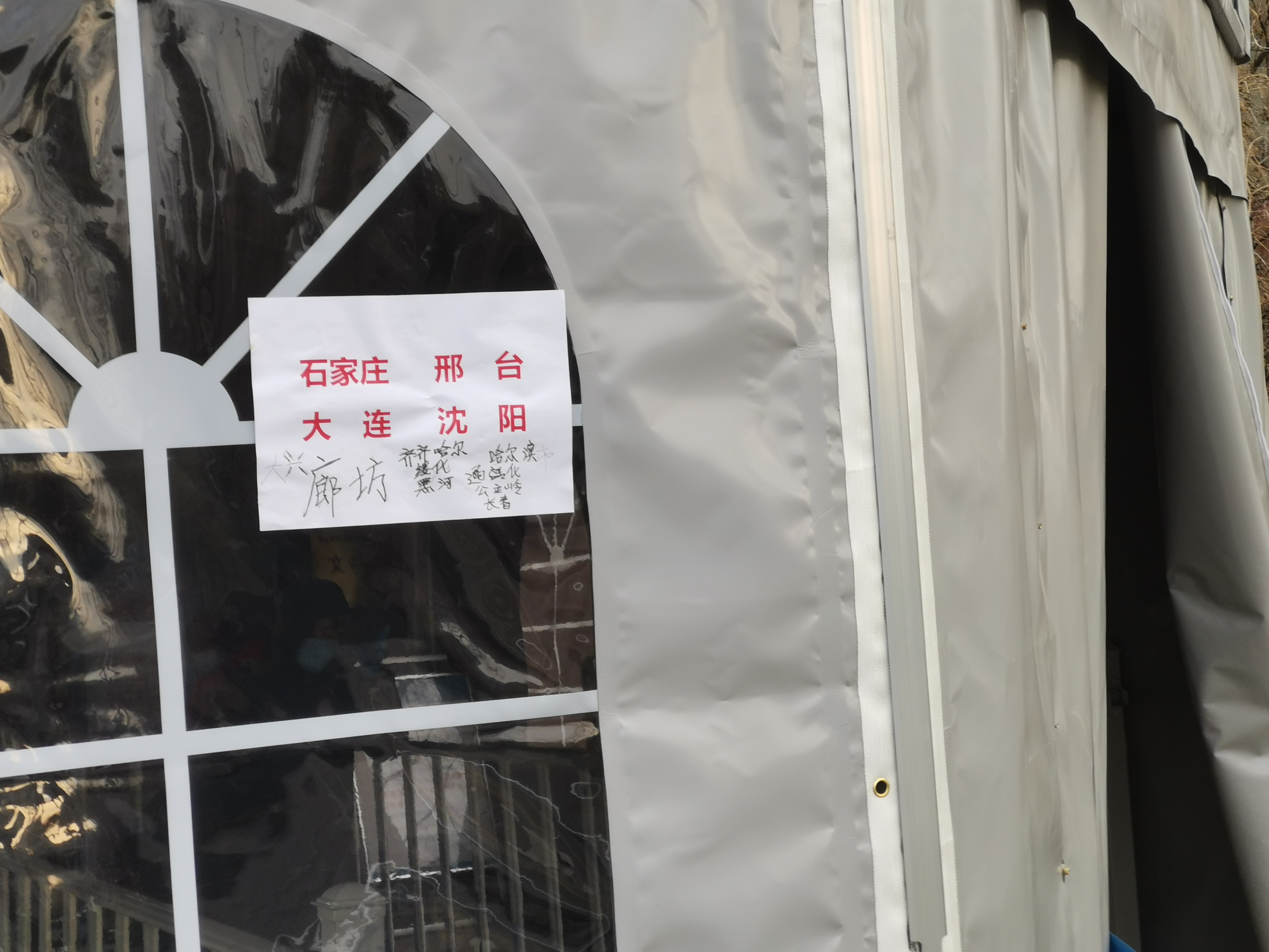 ↑1月19日,中国医学科学院肿瘤医院的安检帐篷上张贴的告示,通信大数据行程卡显示14天内到过上述城市和地区的患者,无法进入医院。