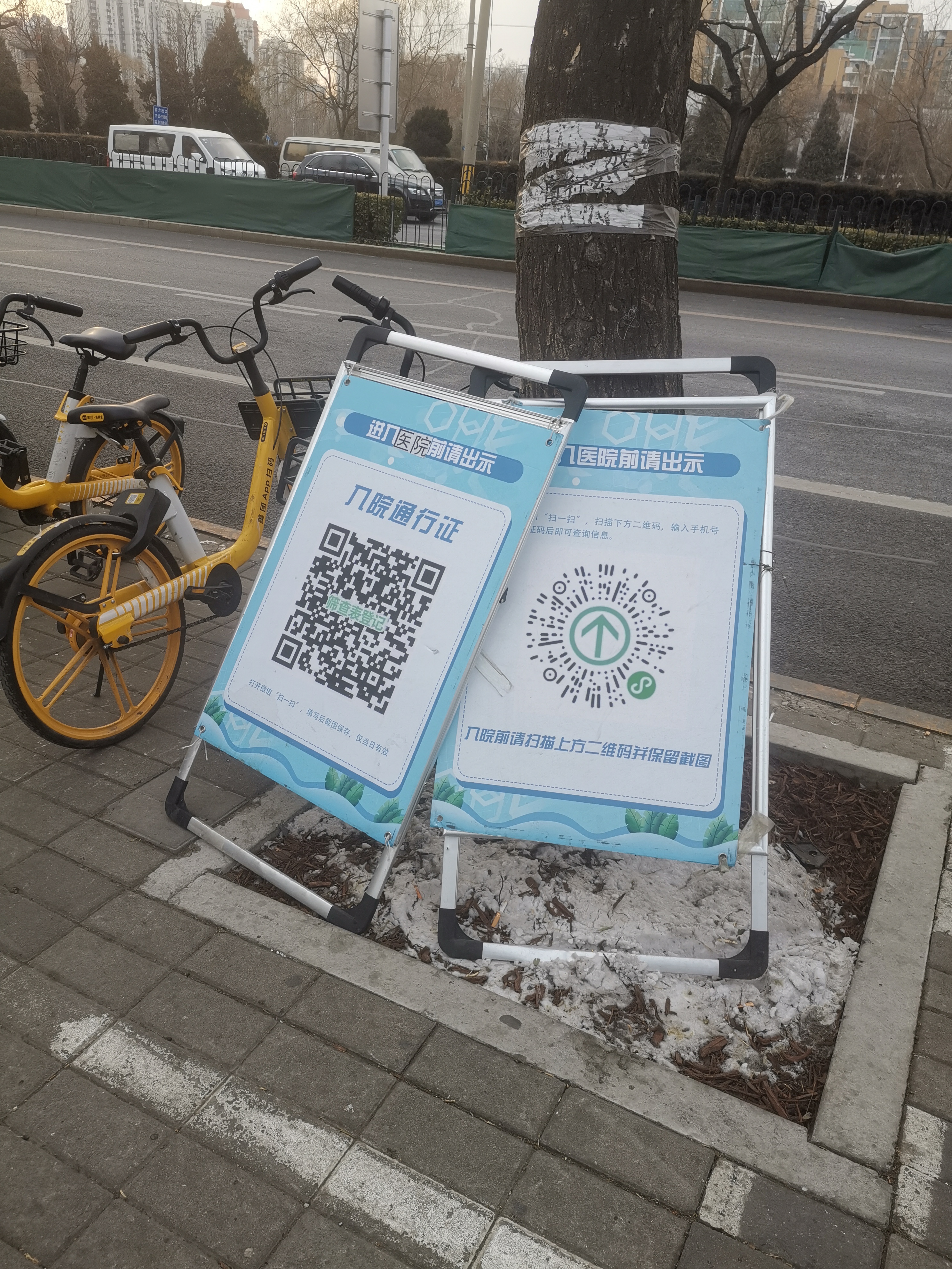 ↑1月19日,中国医学科学院肿瘤医院外,摆着就诊患者入院时必须要扫的二维码。