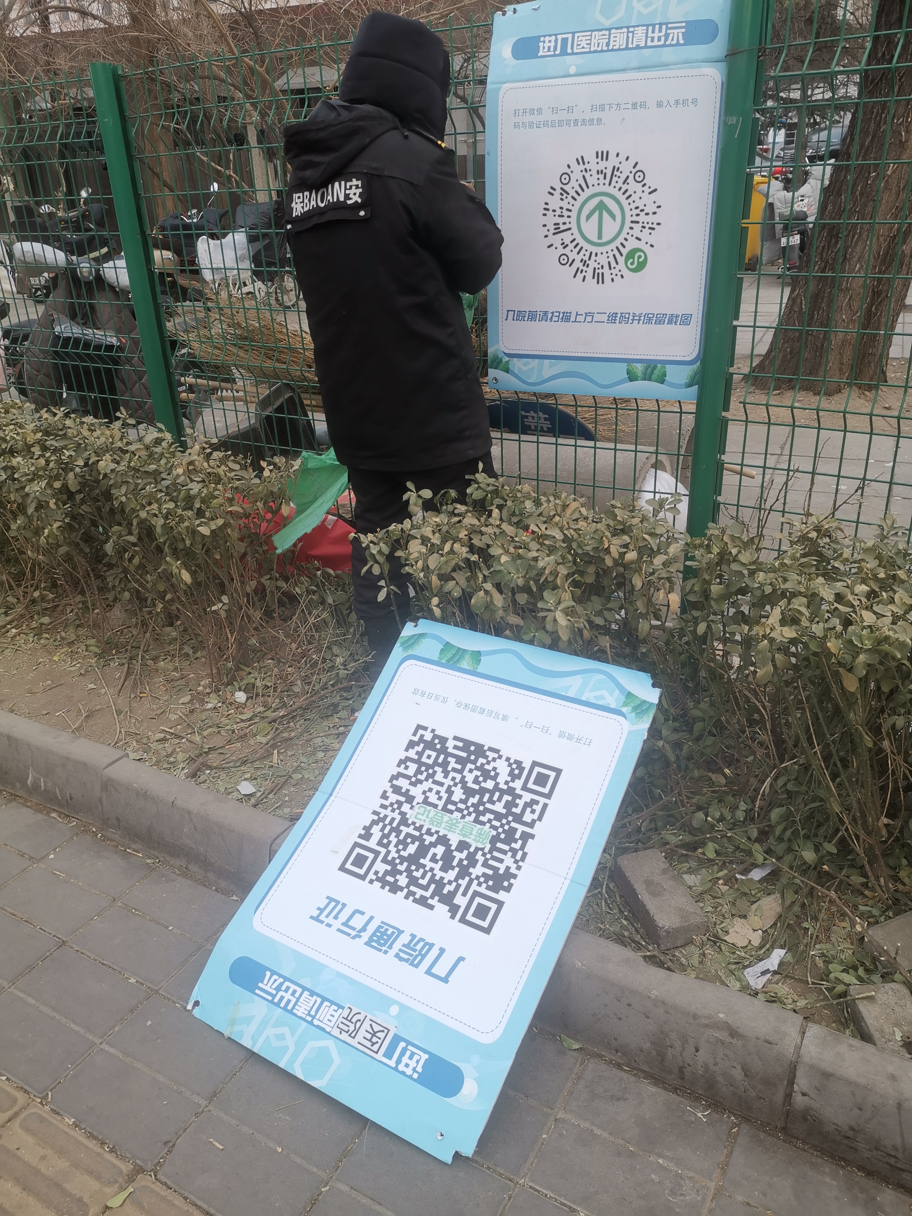 ↑1月19日,中国医学科学院肿瘤医院的保安在院外挂通信大数据行程卡的二维码。