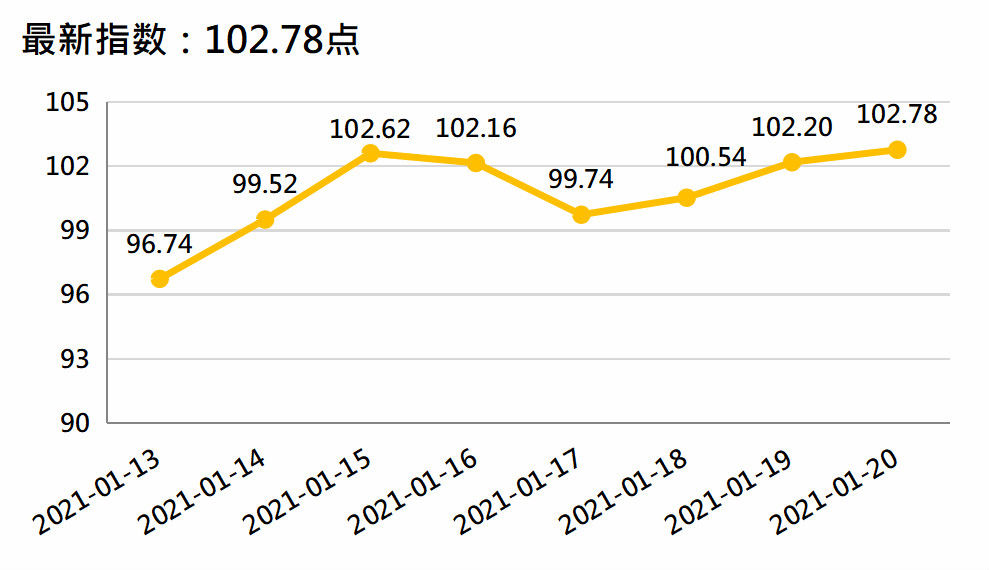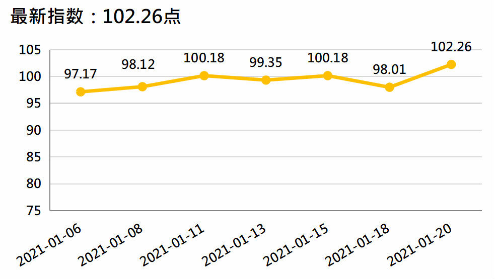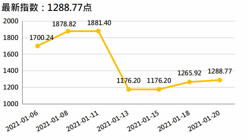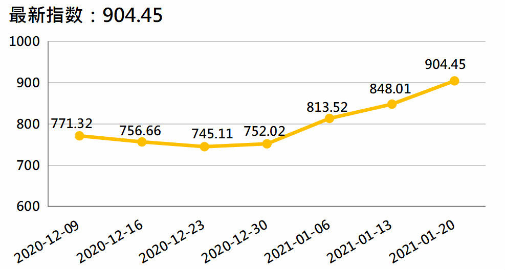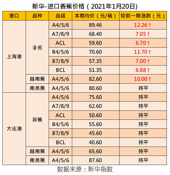 新华财经北京1月21日电(李水艳、李伯罧、薛志烜)新华-中国香蕉产业四大指数显示,截至1月20日,国内香蕉产地价格指数报102.26点,较上一发布日(2021年1月13日,下同)99.35点上涨2.93%;香蕉销地批发价格指数报102.78点,较上一发布日96.74点上涨6.24%;进口蕉价格指数报904.45点,较上一发布日848.01点上涨6.66%;皇帝蕉产地价格指数报1288.77点,较上一发布日1176.20点上涨9.57%。
