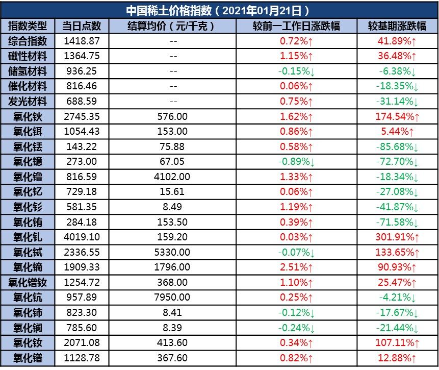 新华财经北京1月21日电(刘星麟)21日,中国稀土价格指数报1418.87点,较前一工作日上涨10.16点,涨幅为0.72%。氧化镝报价坚挺上扬,上游分离厂、持货商惜售观望,下游企业询单活跃度提高,实际成交量增加。