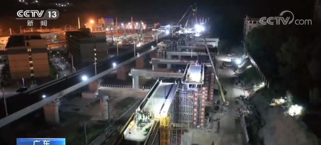 赣深高铁下行疏解线是赣深高铁往南侧开行的一条支线,在光明城站与赣深高铁主线分离后,将与已经通车使用的深圳北站相连通。其中的福龙路特大桥长约1650米,从上部跨越珠三角地区铁路干线广深港高铁线,施工难度巨大,是整条线路的重点控制性工程。此次箱梁横移完成施工,相当于这一路段的高铁线路路基完成建设,后续将进行轨道铺设等施工,为整条线路在今年年底通车奠定了基础。