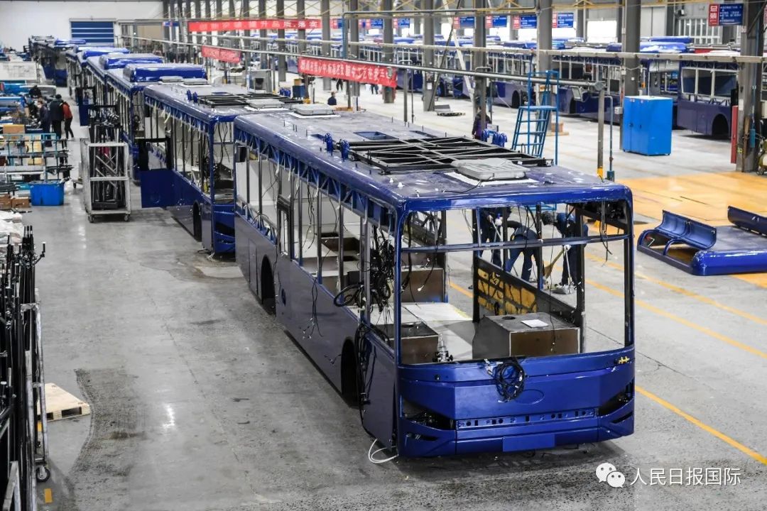 2021年1月6日拍摄的南京溧水经济开发区开沃新能源汽车集团大客车总装车间。新华社记者李博摄