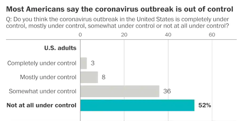 不过民调显示,尽管新冠疫情形势危急,美国民众对于新冠疫情危险程度持有不同态度,不同党派的美国人对于家人可能感染新冠病毒的看法也有所不同。80%的民主党人认为,他们对此感到十分担忧,而只有40%的共和党人和60%的无党派人士表达了略有担忧。
