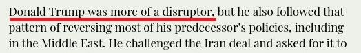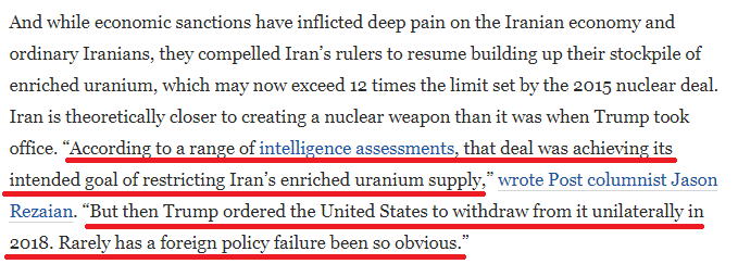 《华盛顿邮报》专栏作家贾森·礼萨安在文中写道,伊核协议原本正在实现其限制伊朗浓缩铀供应的既定目标,但随后特朗普却命令美国在2018年单方面退出了该协议。“很少有失败得如此彻底的外交政策”。