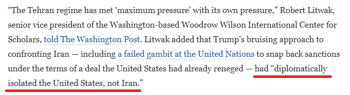 《华盛顿邮报》的报道指出,越来越多的国家已经厌倦了美国的单边主义行为,更不愿执行美国制定的限制措施,欧洲投资者正在探索开发伊朗市场的新机会。伍德罗·威尔逊国际学者中心高级副主席罗伯特·利特瓦克接受《华盛顿邮报》采访时表示,特朗普对伊朗的粗暴做法已经“在外交上孤立了美国,而不是伊朗”。