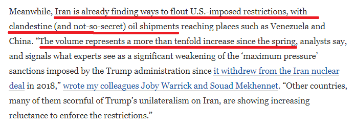 《华盛顿邮报》以《特朗普的伊朗政策将以失败告终》为题发文指出,特朗普四年来的反伊朗“鹰派立场”没什么效果。与他的政府的说辞相反,恢复制裁并没有让伊朗接受一项更强硬的协议。与此同时,伊朗通过各种途径使石油出口量自2020年春天以来增加了10倍以上,明显削弱了极限施压的效力。