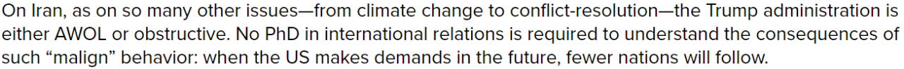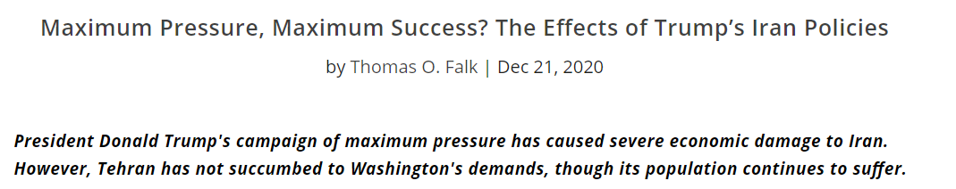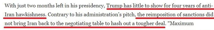或许,美国智库大西洋理事会一篇文章的结语可以为特朗普政府在伊朗问题上的四年表现盖棺定论:特朗普政府对待伊朗就像对待气候变化等许多其他问题一样,其“恶意”行为的后果就是,未来当美国再提要求时,跟风的国家会变得更少。“极限施压战略的输家将是法治,而最终输掉的是美国的领导地位”。