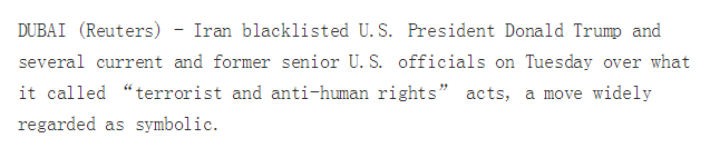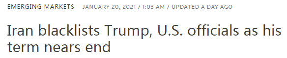 同一天,伊朗外交部发言人哈提卜扎德宣布,伊朗已将时任美国总统特朗普、国务卿蓬佩奥等9名美国高官列入制裁名单,因为他们参与了针对伊朗国家和伊朗公民的“恐怖主义和侵犯人权行动”。