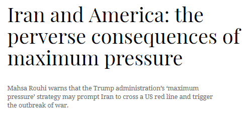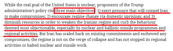 英国智库国际战略研究所(IISS)去年早些时候就以《美国对伊朗的极限施压适得其反》为题发文指出,特朗普政策的支持者们曾提到了对伊朗极限施压的三个主要目标——迫使伊朗妥协、推动伊朗政权更迭、遏制伊朗的行动能力,但时至今日,伊朗始终没有屈服。