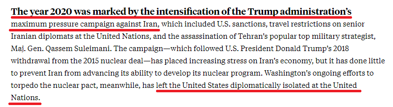 美国《外交政策》杂志以《最大压力,最小收获》为题发文指出,特朗普政府不断强化对伊朗的极限施压成为了2020年的一个标志,但其结果反而让美国在联合国陷入了外交孤立。