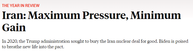 四年前上台的特朗普政府把对伊朗“极限施压”作为其“新中东政策”的核心,并于2018年5月单方面宣布退出伊核协议,同时恢复了对伊制裁。在刚刚过去的2020年,以1月美军暗杀伊朗将领苏莱马尼为起点,美国对伊全面打压不断升级,使双方关系降到了史上少有的冰点。