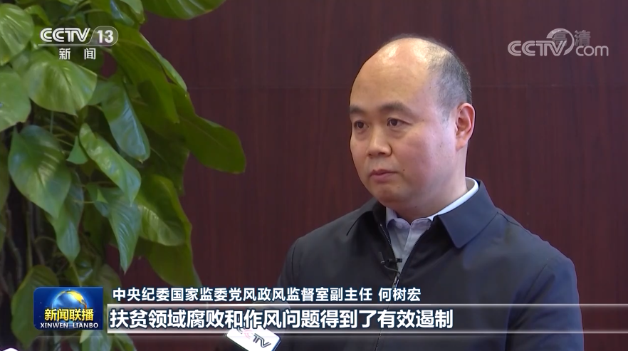 中央纪委国家监委党风政风监督室副主任 何树宏:通过持续加大监督执纪问责力度,扶贫领域腐败和作风问题得到了有效遏制,为实现脱真贫、真脱贫、提高脱贫成色提供了有力保障。脱贫摘帽不是终点,纪检监察机关将一以贯之,以过硬作风保障巩固脱贫攻坚成果。