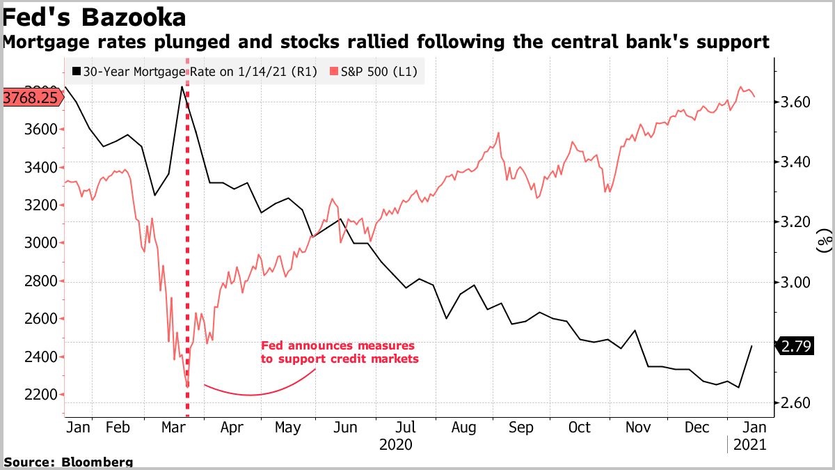 这些前所未有的力度使处于美国经济阶梯高处的人以创纪录的低利率为抵押贷款再融资、购置房产。根据房利美的数据,再融资已加速至二十年来最快水平。