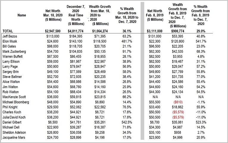 福布斯一项最新报告显示,美国651名亿万富翁的总资产从2020年3月18日的2.95万亿美元,升至2020年12月7日的4.01万亿美元,增长了36.1%。