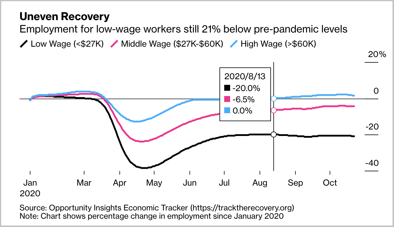 相对而言,高收入者更容易从经济低迷中恢复。根据Opportunity Insight发布的经济模型,高薪阶层的就业率在去年8月就已恢复到疫情前的状态,而底薪者的就业率仍比疫情发生前低21%。