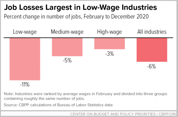 这其中大部分失业者都集中在低收入行业。根据美国劳工部的数据,2020年2月至12月期间,低收入行业的工作岗位减少了11.3%,是中等工资行业的岗位减少(4.9%)的2倍,是高工资行业岗位减少(3.0%)的近四倍。