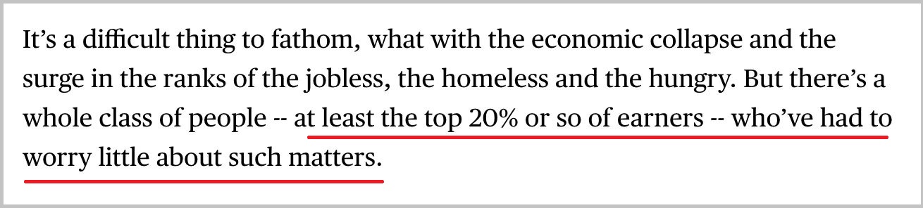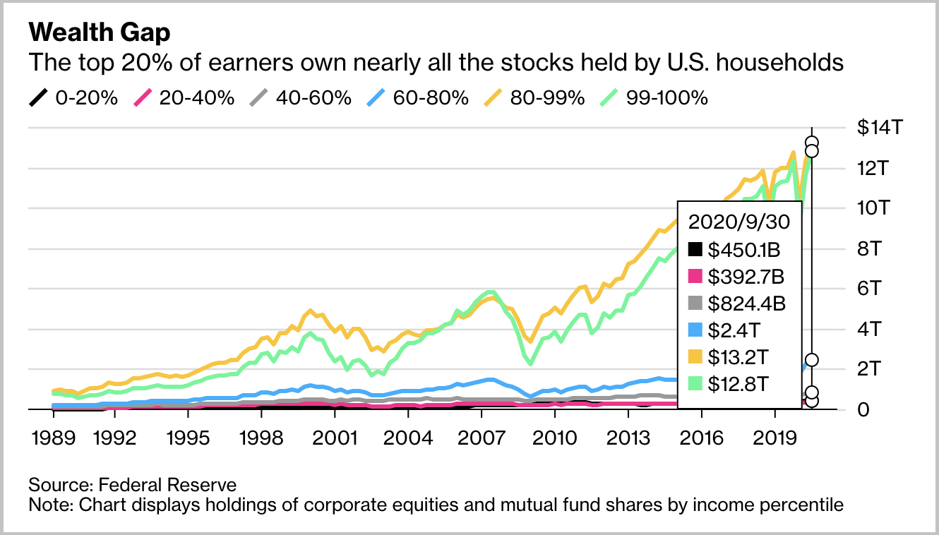 彭博社报道也指出,富人们在疫情之际前所未有地铸造财富。“随着经济的崩溃,失业者、流浪汉数量激增,但一部分美国人并不需为此担心,那就是收入为前20%的美国富人。”根据美联储的数据,前20%盈利者几乎拥有了家庭部门所持有的全部股票。