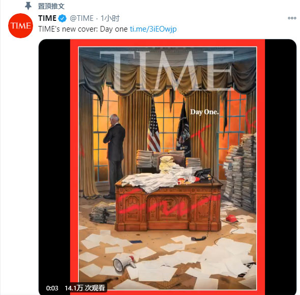 长达15秒的动画视频显示,拜登站在白宫办公室,窗外不时有火光显现,而他身后的文件积压如山,还有不少纸张散落一地,场面一片混乱。《时代周刊》在封面上还写着“第一天”(Day One)的字样,以此显示拜登就职总统后第一天所面临的混乱局面。