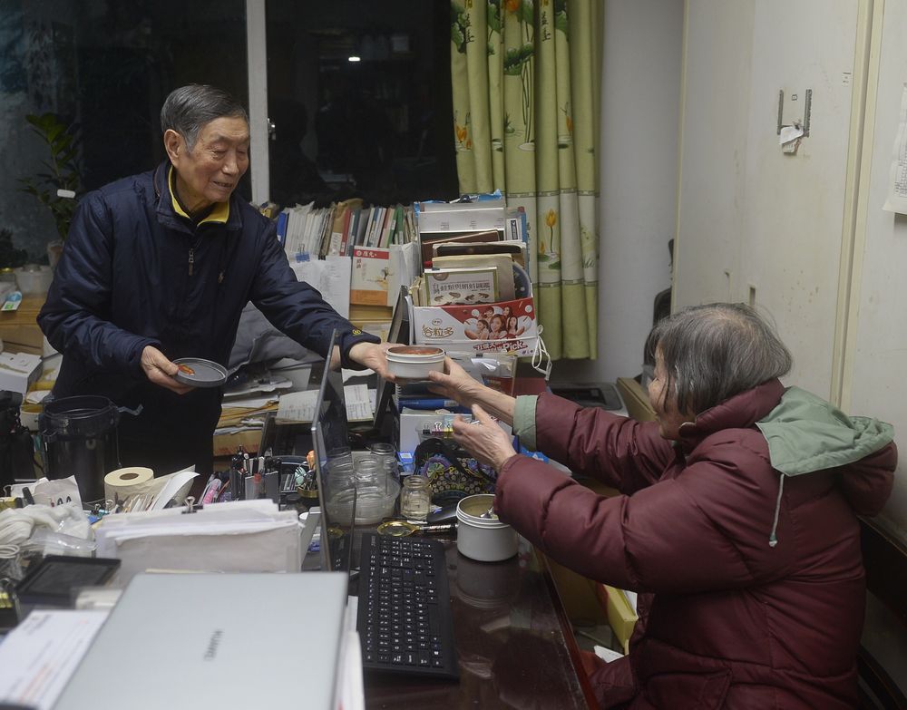 ↑1月14日,费梁(左)将晚饭递给叶昌媛。费梁、叶昌媛夫妇几乎每天晚饭都在办公室吃,以此节约时间,延长工作时间。