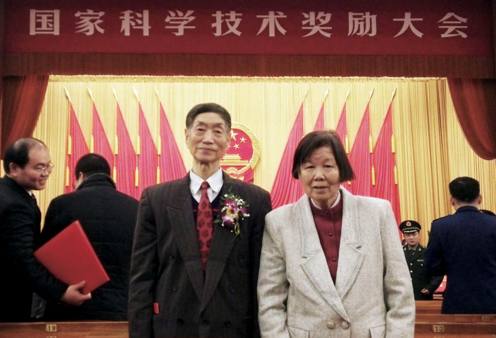 ↑ 2015年1月9日,费梁(左)、叶昌媛夫妇在北京人民大会堂参加国家科学技术奖励大会。他们和团队获得国家自然科学奖二等奖。